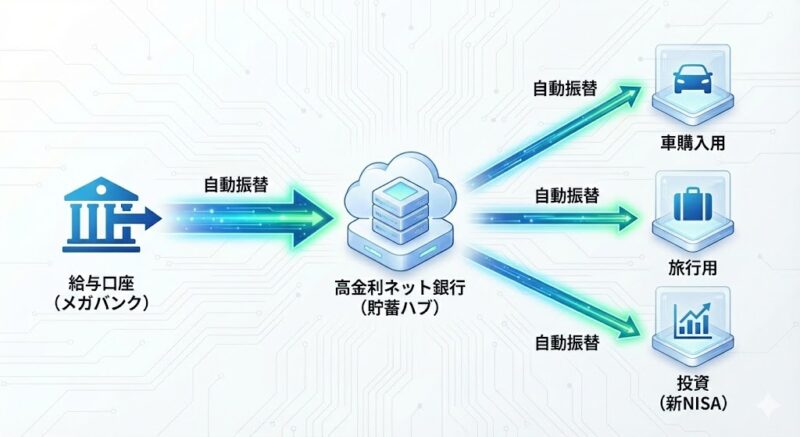 • 構築方法:給与が入るメガバンク(親口座)から、高金利のネット銀行(貯蓄口座)へ、毎月25日に自動で5万円を「吸い上げる」設定にします。