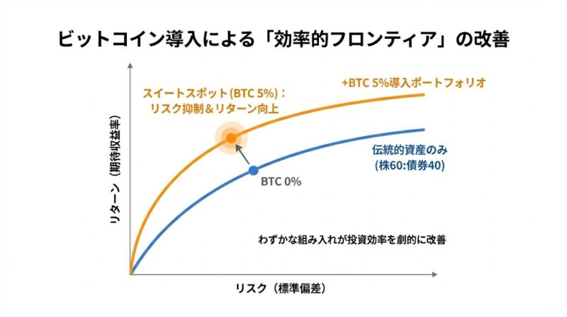投資の世界には、リスク(標準偏差)あたりのリターンを最大化する「効率的フロンティア」という概念があります。ビットコインをポートフォリオに加える際、この「5%」という数字には明確なロジックが存在します。