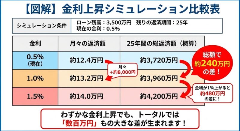 「月8,000円ならなんとかなる」と思いましたか? しかし、これが 1.0%上昇(金利1.5%) になると、差額は 月々 +約1.7万円(年間 +約20万円) にまで跳ね上がります。