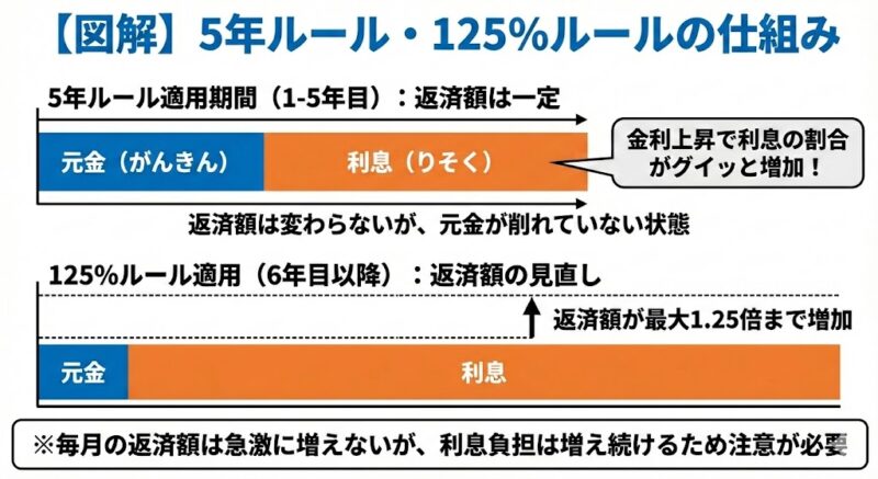 多くの変動金利には「5年ルール(5年間は返済額を変えない)」と「125%ルール(増額しても前の1.25倍まで)」という仕組みがあります。