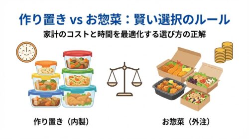 - 手間のかかる料理は外注する: 揚げ物など準備が大変なものは、お惣菜を買った方が、片付けの時間や光熱費を含めたトータルコストで安くなる場合があります。